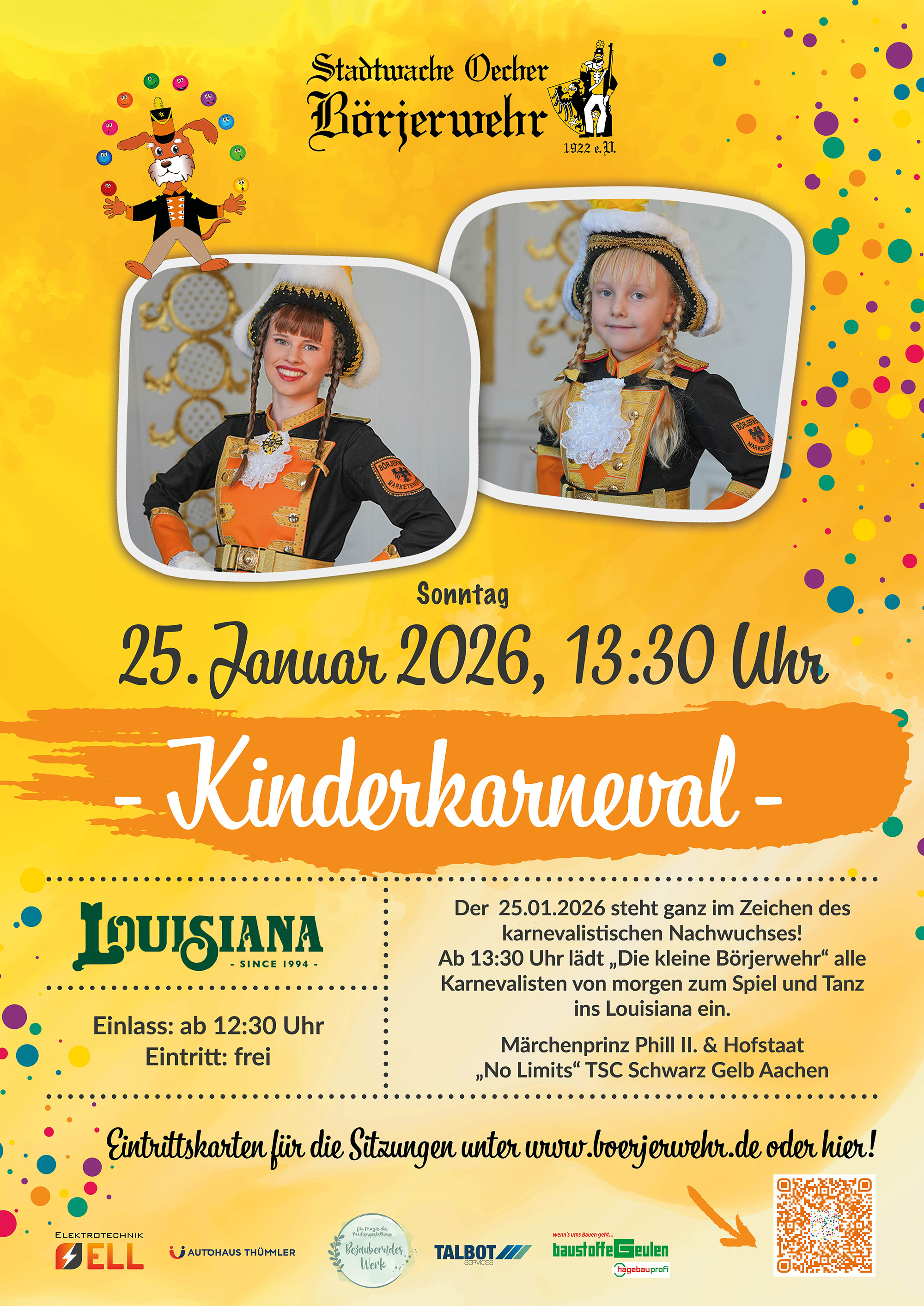 Der 25.01.2026 steht ganz im Zeichen des karnevalistischen Nachwuchses! Ab 13:30 Uhr lädt „Die kleine Börjerwehr" alle Karnevalisten von morgen zum Spiel und Tanz ins Louisiana ein.