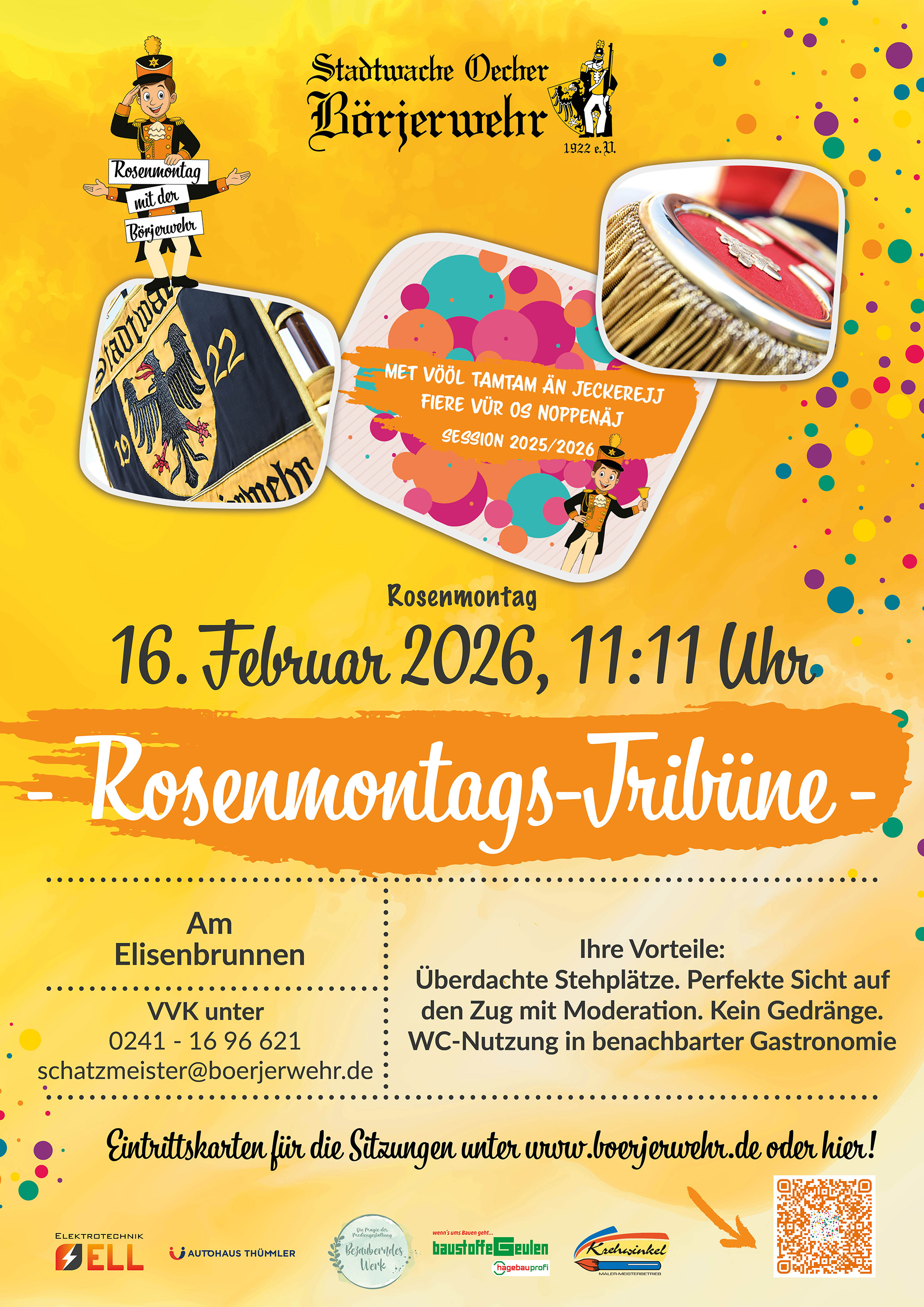 Am Karnevalsfreitag lädt die Stadtwache Oecher Börjerwehr 1922 e.V. zur großen Sitzung ins Eurogress. Ab 20:00 Uhr (Einlass 19:00 Uhr mit musikalischem Vorprogramm) erwartet Sie ein närrisches Programm der Extraklasse gefolgt von einer After-Show-Party mit unserem Haus-DJ. Die Sitzung hat in Aachen und der Euregio einen „Kultstatus“ erreicht - und Sie können dabei sein! (Eintritt 30,00 Euro)