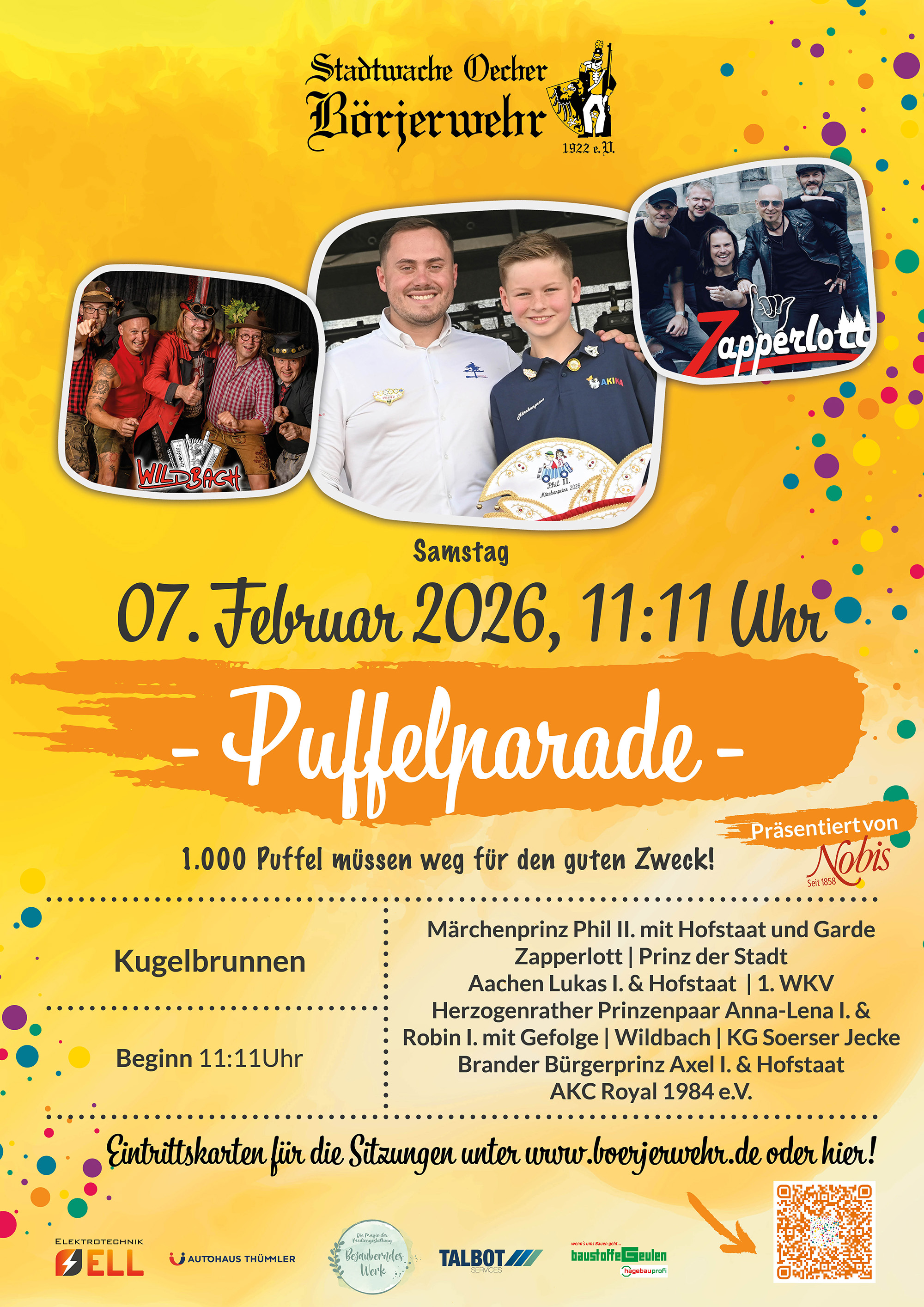 Mittlerweile schon eine traditionelle Veranstaltung - die Puffelparade der Stadtwache Oecher Börjerwehr 1922 e. V. im Herzen der Shoppingmeile Adalbertstraße (Kugelbrunnen)! Am 07.02.2026 heißt es ab 11:11 Uhr: „1.000 Puffel müssen weg - für den guten Zweck!“. Eingebettet in ein närrisches, kostenloses Programm auf unserer Open-Air-Bühne werden im Rahmen der Puffelparade 1.000 Puffel für einen guten Zweck verkauft. Der Reinerlös des Puffelverkaufs kommt der Pfarre St. Adalbert zugute. (Eintritt frei)